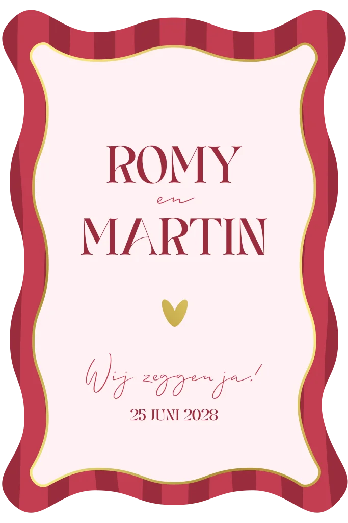 Een vrolijke en stijlvolle trouwkaart in een speels geschulpt formaat. De achtergrond is voorzien van brede, donker roze en rode strepen die een feestelijke touch geven. In het midden straalt een zachtroze vlak met sierlijke typografie en een warm goudfolie hartje. De gouden accenten zorgen voor een luxe uitstraling, zonder dat het te formeel wordt. Perfect voor een bruiloft met een vrolijk en liefdevol karakter. Pas deze kaart eenvoudig aan met jullie eigen namen en trouwdatum.