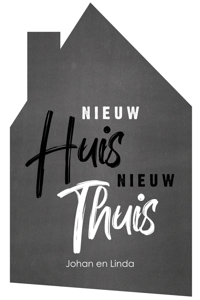 Originele verhuiskaart/ adreswijziging. Laat familie en vrienden je nieuwe adres weten met deze bijzondere en originele adreswijziging in de vorm van een huisje. Deze stoere verhuiskaart heeft een krijtbord-look met daarop een tekst. Pas de kaart naar wens aan en maak er zelf jullie unieke verhuiskaart van.