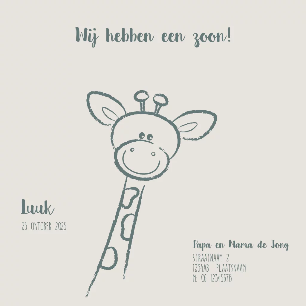 Origineel geboortekaartje voor een jongen met een doorkijk luikje naar de binnenzijde in de vorm van een hartje. Bij dit schattige geboortekaartje zie je een illustratie van een lief girafje.