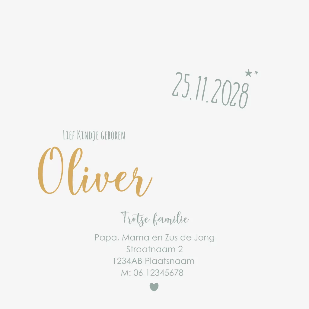Origineel geboortekaartje voor een jongen met een doorkijk luikje naar de binnenzijde in de vorm van een hartje. Bij dit blauw-groene geboortekaartje zie je een tekening van een schattig baby olifantje met een goudfolie tekst en sterretjes. Aan de binnenzijde is een hartje met stippellijn zichtbaar. Deze wordt niet gedrukt, maar is om aan te geven wat je aan de voorzijde te zien krijgt door het doorkijk luikje. Pas het kaartje naar wens aan en vraag eerst een proefdruk aan van jouw ontwerp. BELANGRIJK om te weten. De kaarten met een doorkijk luikje kun je niet voorzien van ronde hoeken. We raden ook aan dit niet aan te vinken.
