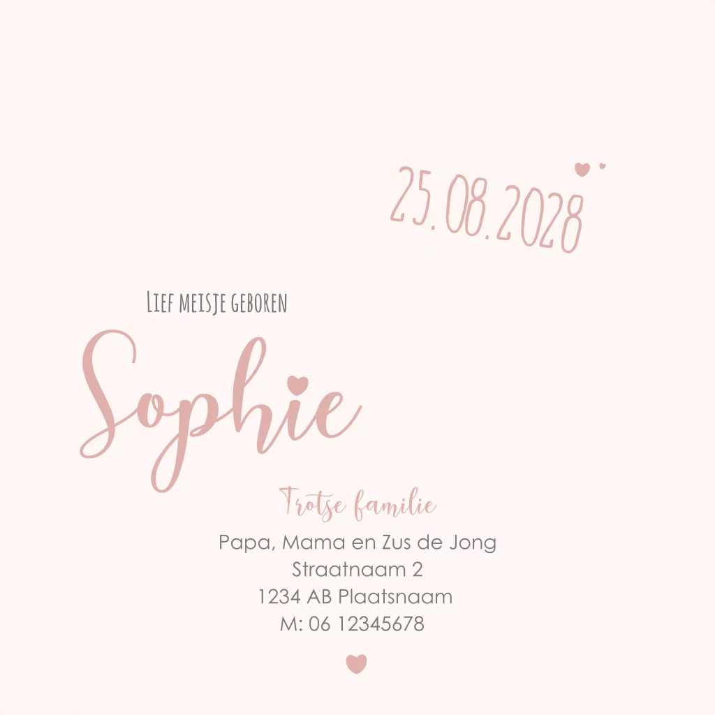 Origineel geboortekaartje voor een meisje met een doorkijk luikje naar de binnenzijde in de vorm van een hartje. Bij dit roze geboortekaartje zie je een tekening van een schattig baby girafje met de babynaam gedrukt met goudfolie en hartjes. Aan de binnenzijde is een hartje met stippellijn zichtbaar. Deze wordt niet gedrukt, maar is om aan te geven wat je aan de voorzijde te zien krijgt door het doorkijk luikje. Pas het kaartje naar wens aan en vraag eerst een proefdruk aan van jouw ontwerp. BELANGRIJK om te weten. De kaarten met een doorkijk luikje kun je niet voorzien van ronde hoeken. We raden ook aan dit niet aan te vinken.