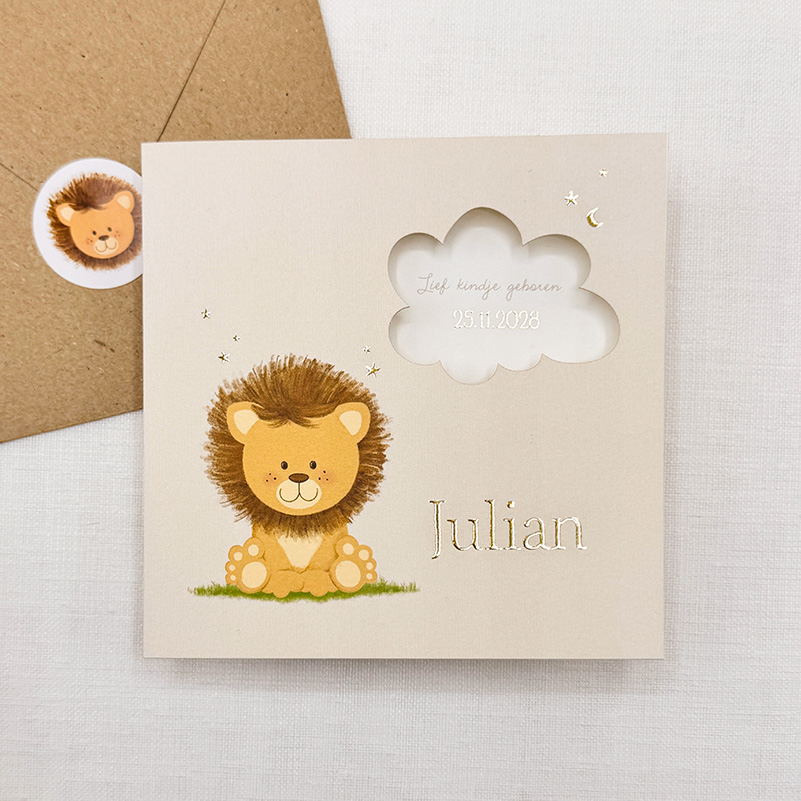 Een geboortekaartje om verliefd op te worden: met een schattig leeuwtje, een speels doorkijkje in de vorm van een wolkje en fonkelende goudfolie details.