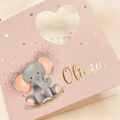 Origineel geboortekaartje voor een meisje met een doorkijk luikje naar de binnenzijde in de vorm van een hartje. Bij dit roze geboortekaartje zie je een tekening van een schattig baby olifantje met een goudfolie tekst en hartjes. Aan de binnenzijde is een hartje met stippellijn zichtbaar. Deze wordt niet gedrukt, maar is om aan te geven wat je aan de voorzijde te zien krijgt door het doorkijk luikje. Pas het kaartje naar wens aan en vraag eerst een proefdruk aan van jouw ontwerp. BELANGRIJK om te weten. De kaarten met een doorkijk luikje kun je niet voorzien van ronde hoeken. We raden ook aan dit niet aan te vinken.