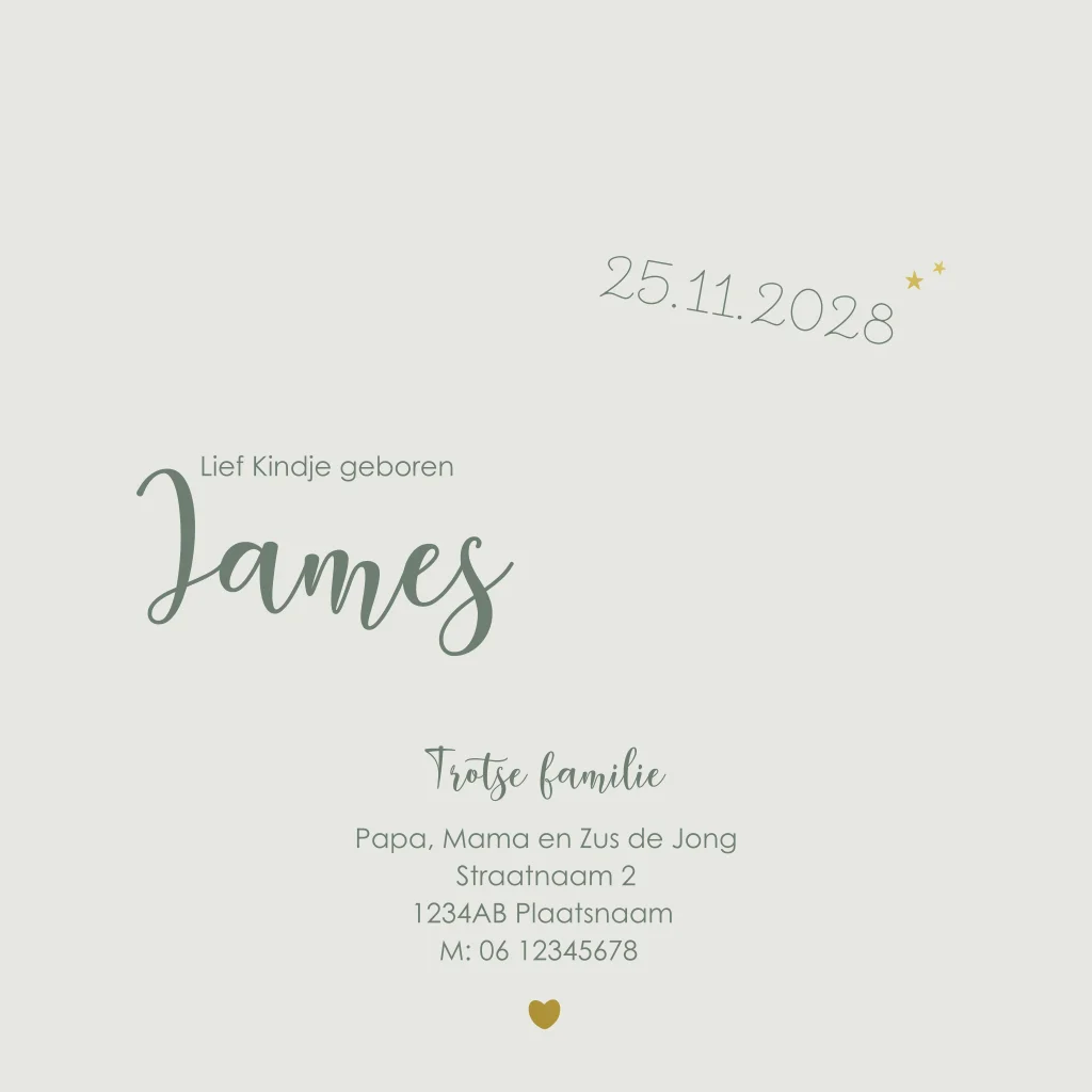 De naam, datum en tekst zijn eenvoudig aan te passen in de editor, zodat je het kaartje helemaal persoonlijk kunt maken.