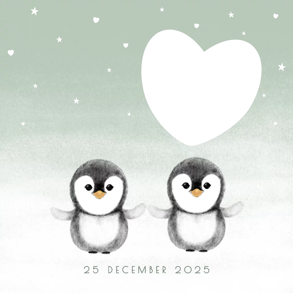 Origineel winters geboortekaartje voor een tweeling met een doorkijk luikje naar de binnenzijde in de vorm van een hartje. Op dit winterse geboortekaartje staat een tekening van twee schattige pinguïns in de sneeuw met hartjes en sterren .