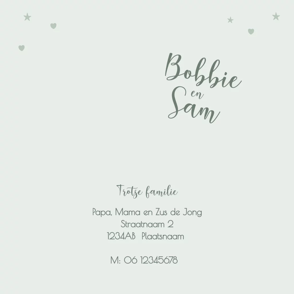 Geboortekaartje tweeling met pinguïn en hartjes doorkijkje