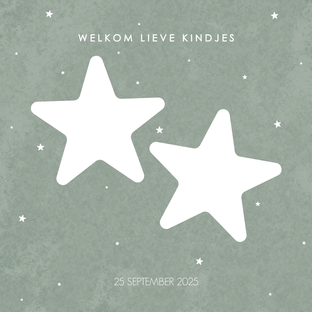 met een groene velvet-look met sterren! Dit stoere kaartje is perfect voor een jongen of meisje en heeft twee sterren als doorkijk-luikje naar de binnenzijde van de kaart. Aan de binnenzijde zijn 2 sterren met stippellijn zichtbaar. Deze worden niet gedrukt, maar om aan te geven wat je aan de voorzijde te zien krijgt door de doorkijk luikjes. Pas het geboortekaartje voor jullie tweeling naar wens aan en vraag eerst een proefdruk aan van jouw ontwerp. BELANGRIJK om te weten: de kaarten met een doorkijk-luikje kun je niet voorzien van ronde hoeken. We raden ook aan dit niet aan te vinken.