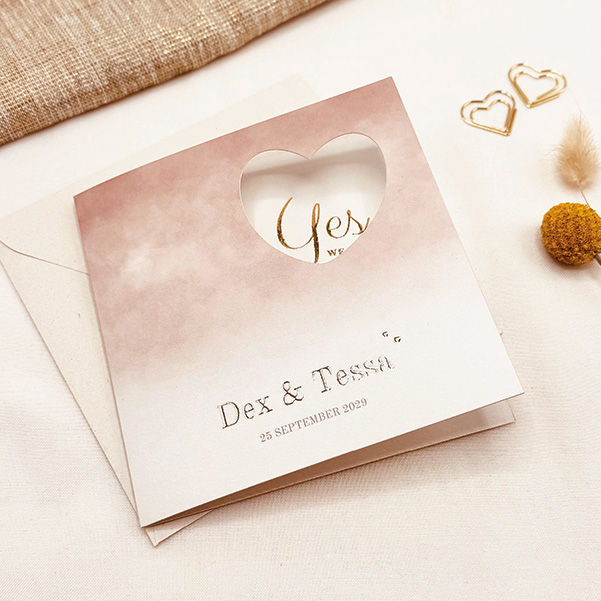 Deze elegante trouwkaart heeft een romantische uitstraling met een zachte beige tint en een wolkachtige structuur die overloopt in een subtiele wit-roze onderkant. Het hartvormige doorkijkluikje onthult een mooie goudfolie tekst binnenin, wat de kaart een unieke, persoonlijke touch geeft. Pas de kaart volledig aan en vraag een proefdruk aan om het perfecte resultaat te zien. Let op: kaarten met een doorkijk-luikje kunnen niet worden voorzien van ronde hoeken.