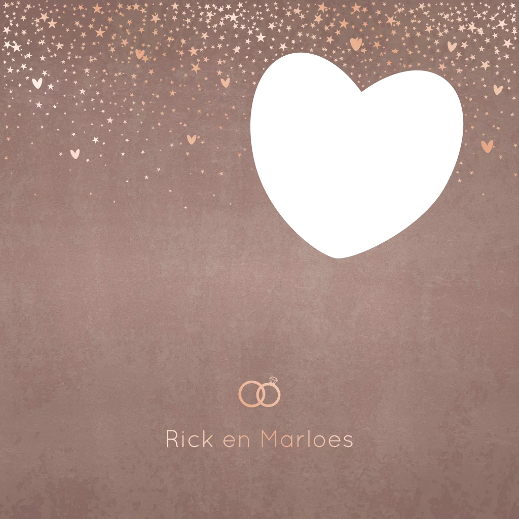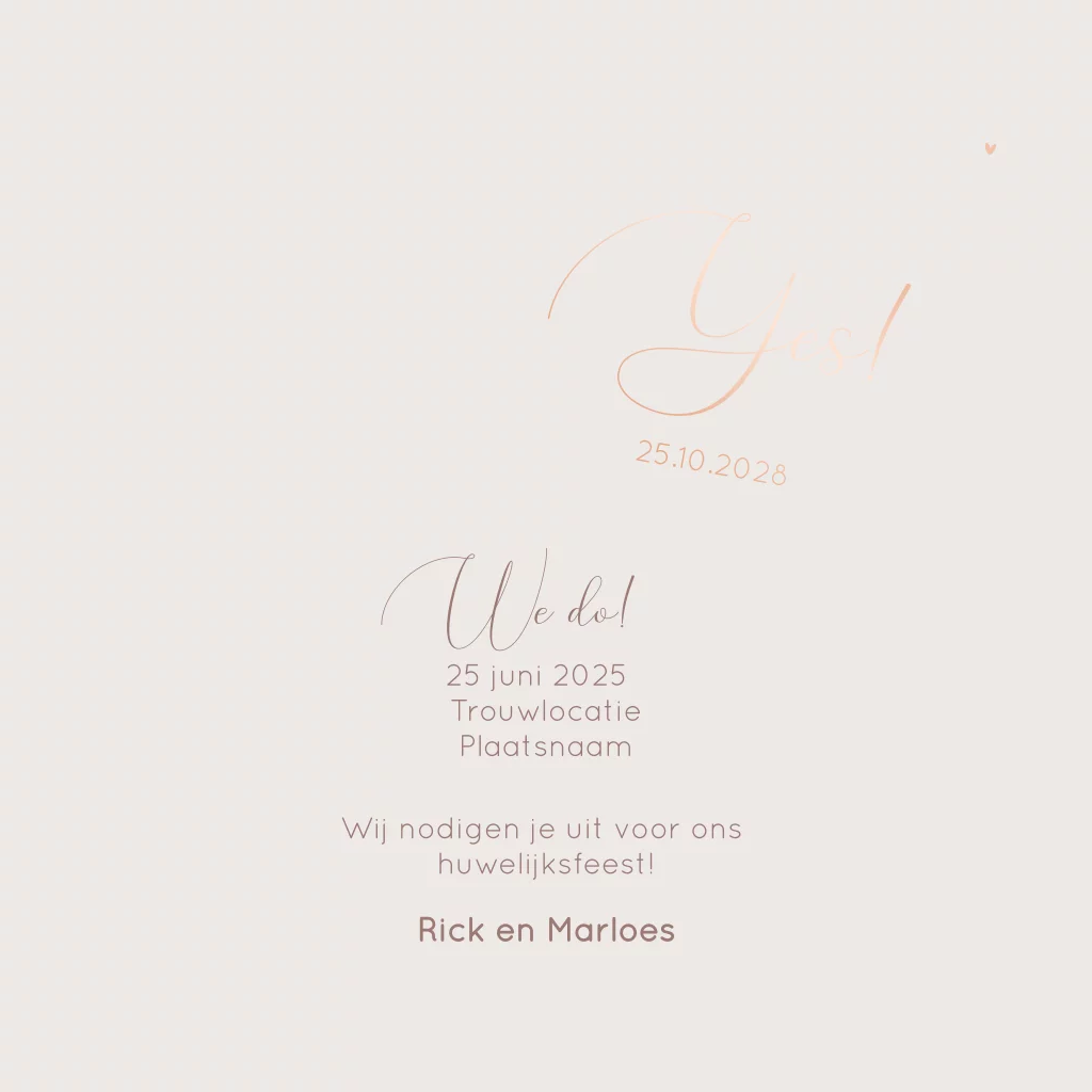 Personaliseer deze kaart volledig naar wens en bestel een proefdruk om het prachtige resultaat in het echt te bewonderen. Voeg een unieke, romantische touch toe aan jullie grote dag met deze bijzondere trouwkaart!