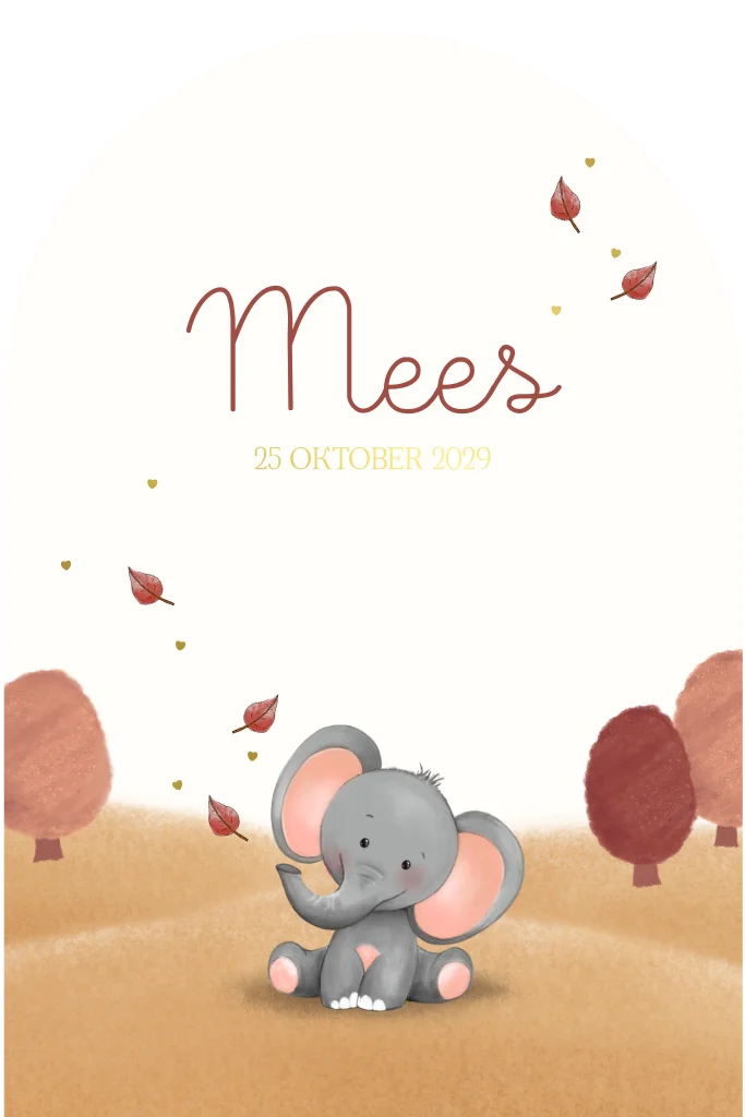 Het lieve olifantje speelt tussen vallende herfstblaadjes op een warme zandkleurige achtergrond. De ronde boogvorm en zachte tinten geven het kaartje een unieke, eigentijdse uitstraling. De naam en geboortedatum kunnen volledig naar wens worden aangepast en eventueel in goudfolie worden gedrukt voor een luxe afwerking.