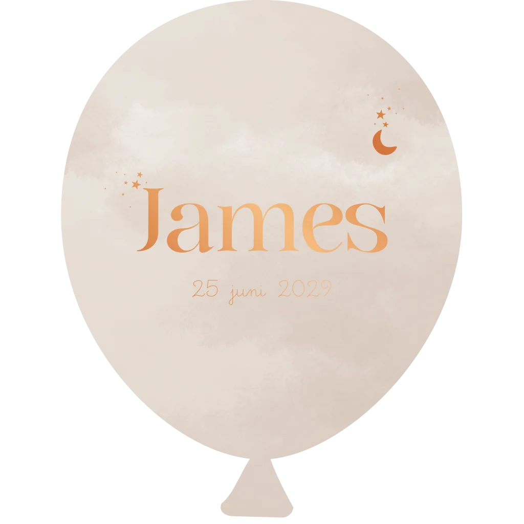 Dit originele geboortekaartje in ballonvorm heeft een rustige uitstraling in zachte beige en naturel tinten. De naam in koperfolie en de kleine sterretjes met maantje geven het ontwerp een warme en luxe afwerking.