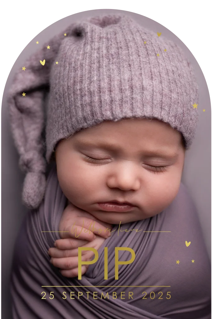Verwelkom jullie kleine wondertje met stijl! Ons exclusieve geboortekaartje met een elegante boogvorm en een foto van jullie kindje bedrukt in schitterend goudfolie. De luxe straalt ervan af, en je kunt het kaartje volledig naar eigen wens aanpassen. Liever een andere folie kleur? Geen probleem! Personaliseer het eenvoudig met een van onze andere prachtige folie kleuren. Creëer een blijvende herinnering met dit unieke en originele geboortekaartje.