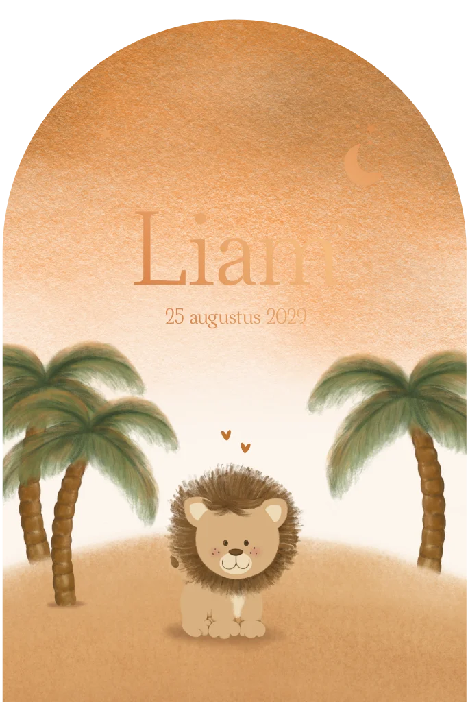 Geboortekaartje boogvorm leeuwtje en palmbomen in koperfolie - Liam