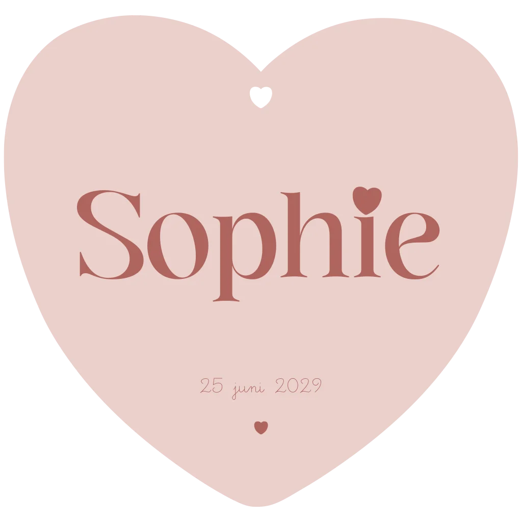 Geboortekaartje hartvorm met naam en gaatje voor lint