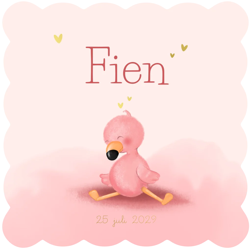 Een lief en zacht geboortekaartje met een schattige flamingo, goudfolie hartjes en een bijzondere golfrand. Perfect voor een meisje en ideaal als je op zoek bent naar een originele vorm met een luxe uitstraling.