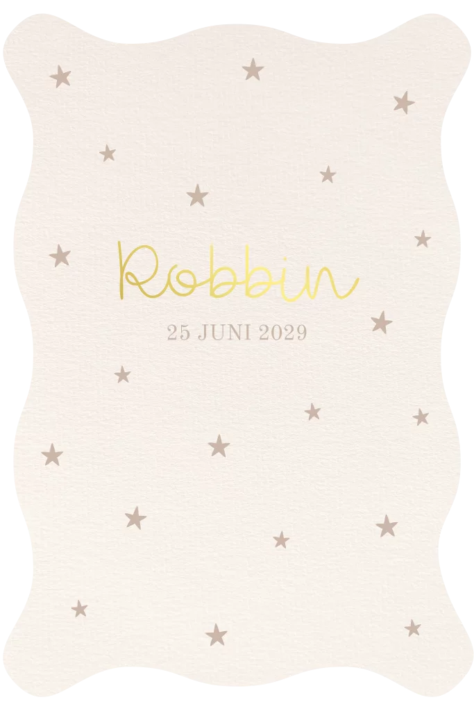 Een stijlvol en rustig geboortekaartje met subtiele sterretjes in foliedruk. De golvende vorm maakt dit ontwerp net wat specialer en geeft het een moderne twist. Perfect voor ouders die van minimalistisch en sfeervol houden. Personaliseer het kaartje eenvoudig met jullie eigen tekst en kies de foliekleur die past bij jullie stijl.