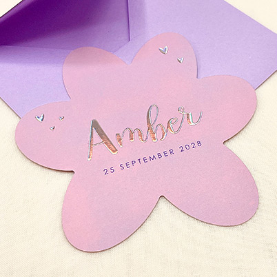 Ontdek onze opvallende geboortekaart voor meisjes, in de vorm van een bloem met paarse en roze tinten. Met een schitterende holografische folie bedrukking voor een vleugje magie. Personaliseer naar wens, bestel een proefdruk en maak de aankondiging extra speciaal. Bijpassende mooie enveloppen beschikbaar bij de kaart. Laat jullie unieke aankondiging stralen met deze kleurrijke bloemenpracht.
