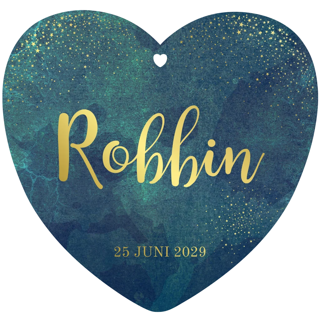Een uniek geboortekaartje voor een jongen, uitgevoerd in de vorm van een hartje met goudfolie bedrukking. Dit stoere blauwe kaartje heeft een klein hartvormig gaatje waar je een mooi velvet lint of touwtje aan kunt vastmaken. Hierdoor kun je op een stijlvolle manier een labeltje of een foto van jullie baby toevoegen. Pas de kaart geheel naar wens aan en bestel een proefdruk om de kwaliteit zelf te ervaren. Maak de aankondiging van jullie zoontje extra bijzonder met dit unieke ontwerp.
