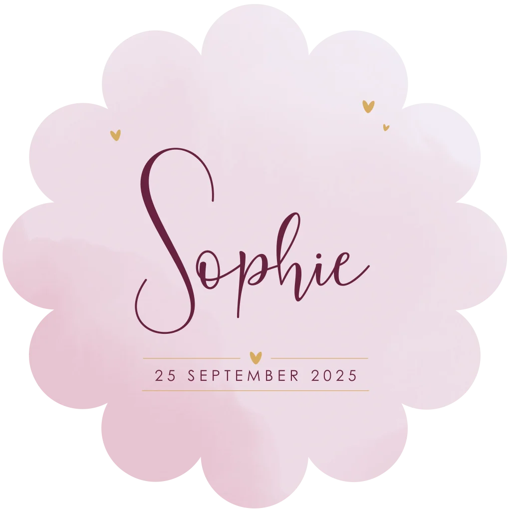 Origineel geboortekaartje in de vorm van een bloem met paarse tinten