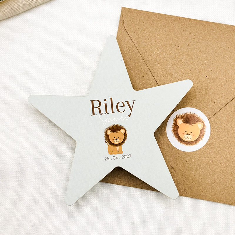 Stervorm geboortekaartje blauw met lief leeuwtje – Riley James