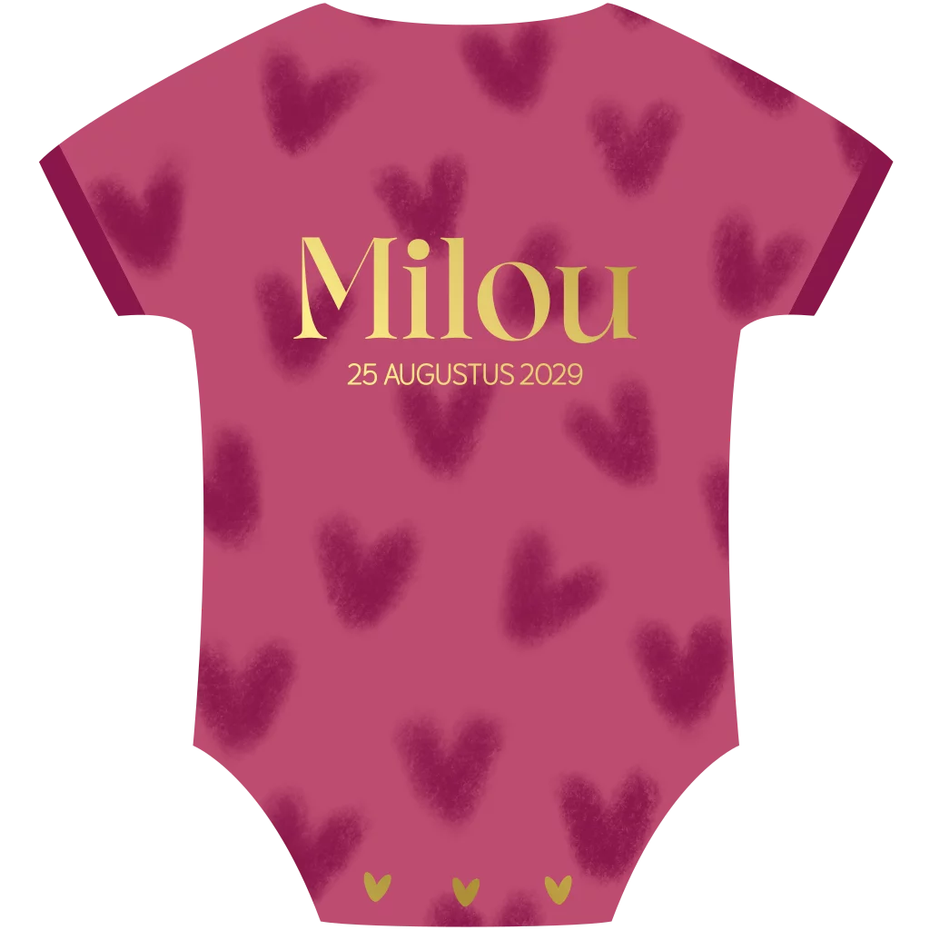 Dit trendy geboortekaartje in de vorm van een rompertje straalt warmte en speelsheid uit! Het ontwerp heeft een opvallende roze achtergrond met een patroon van hartjes in een diepe kersenrode tint. De naam en geboortedatum worden in goudfolie op de voorzijde gedrukt, wat het kaartje een luxe en stijlvolle uitstraling geeft.
