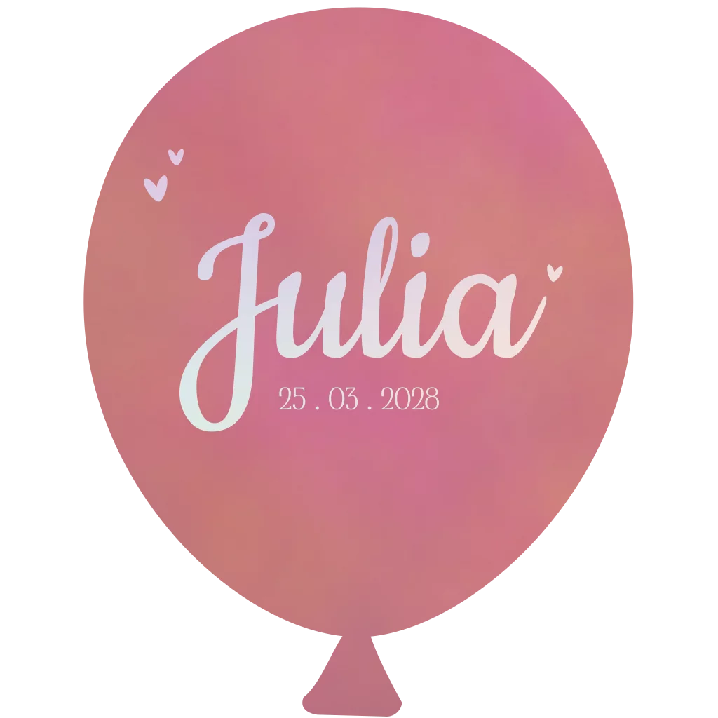 Dit bijzondere geboortekaartje is ontworpen in de vorm van een ballon, perfect om de geboorte van jullie dochter aan te kondigen. De achtergrond heeft warme roze en licht paarse gemêleerde tinten, prachtig afgewerkt met een opvallende holografische bedrukking. Het kaartje kan volledig worden aangepast naar jullie wensen, waardoor het echt uniek is.