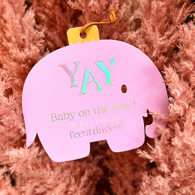 Deze speelse kerstkaart in de vorm van een olifantenornament met kerstbal-haakje is een originele manier om jullie baby-aankondiging te delen. In opvallende lila-paarse tinten staat de vrolijke boodschap: YAY Baby on the way! Oli-fant-astische feestdagen! Door het gaatje bovenin de kaart kun je een lint of touwtje knopen, zodat de kaart als ornament kan worden opgehangen. Je kunt kunt lint of touw los bij het kaartje bestellen. Personaliseer de kaart naar wens en bestel een proefdruk om het resultaat te zien.