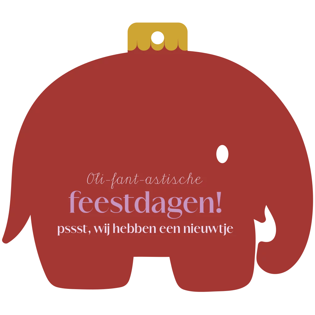 Stuur deze vrolijke kerstkaart in de vorm van een olifantenornament om jullie zwangerschapsnieuws te delen! In feestelijk rood staat de boodschap: Oli-fant-astische feestdagen... Pssst, wij hebben een nieuwtje! Met het gaatje bovenin kun je een lint of touwtje knopen, zodat de kaart als ornament kan worden opgehangen. Linten en touwtjes kun je los bij het kaartje bestellen. Personaliseer de kaart naar wens en bestel een proefdruk om het resultaat te zien.