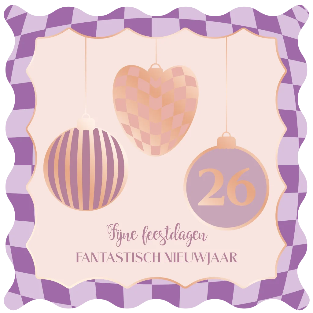 Breng kleur en warmte in de brievenbus met deze feestelijke kerstkaart in trendy roségoud en paars. De retro kerstballen en het speelse hartje zorgen voor een vrolijke, nostalgische twist. De bijzondere golfrand en lila-ruit maken het ontwerp extra uniek.