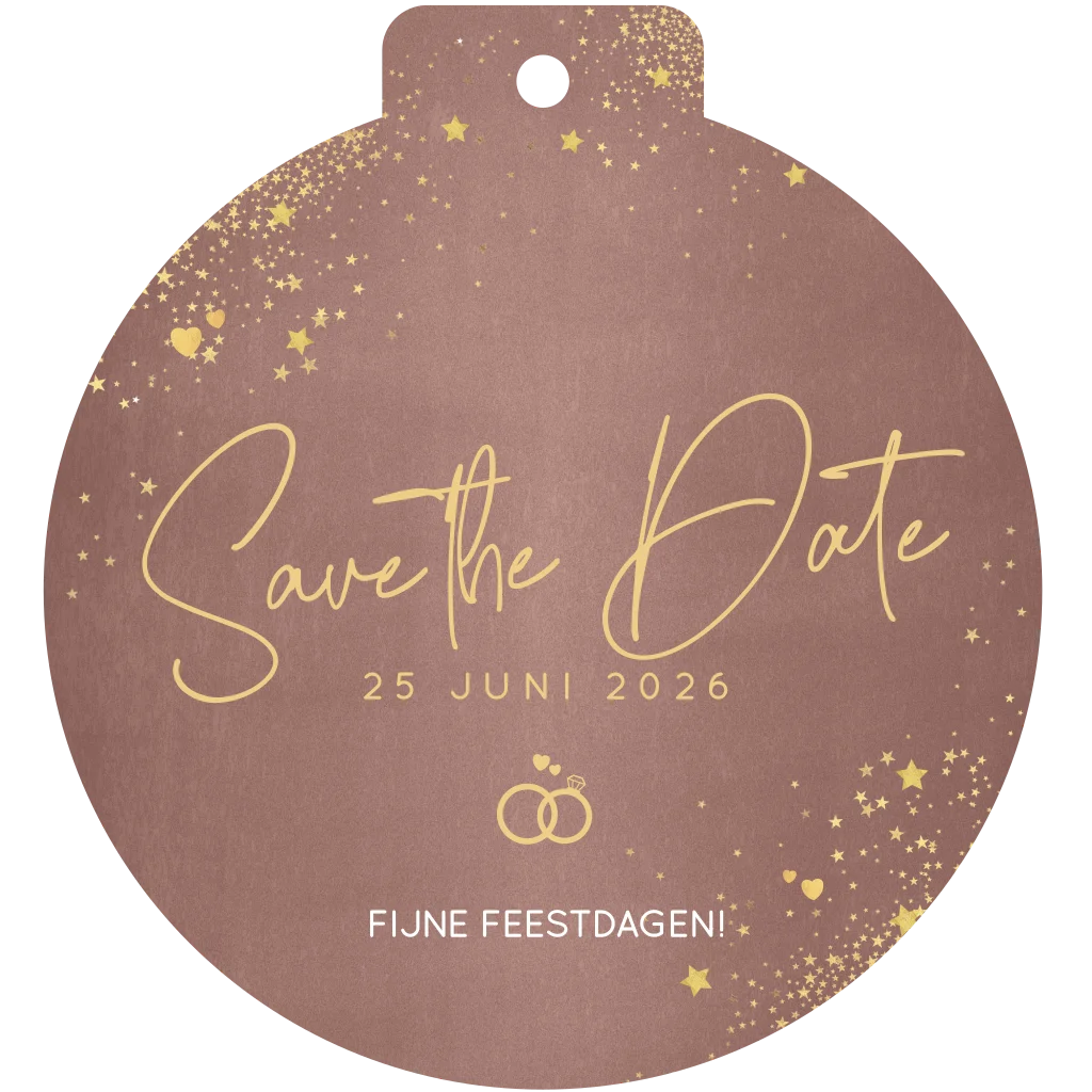 Deze kerstkaart heeft een bruin roze achtergrond met goudkleurige sterretjes. Pas deze mooie save the date kaart naar wens aan en combineer de bekendmaking van jullie trouwdatum met een liefdevolle kerstwens.