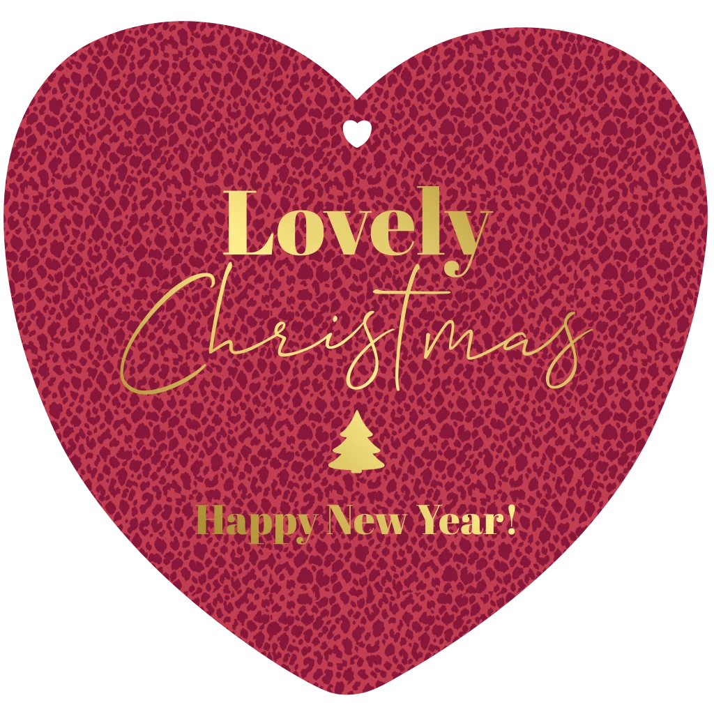 Laat jouw kerstgroet deze feestdagen extra opvallen met deze unieke kerstkaart met panterprint in gedurfde rood-roze tinten en goudfolie bedrukking. De kaart heeft een bijzondere hartvorm met een klein hartvormig gaatje bovenin, perfect om een lint of touwtje doorheen te bevestigen, zodat de kaart ook als kerstdecoratie kan worden opgehangen. Personaliseer de kaart naar wens en bestel een proefdruk. Tip: bestel direct een mooi lint of touw erbij voor een stijlvolle afwerking!