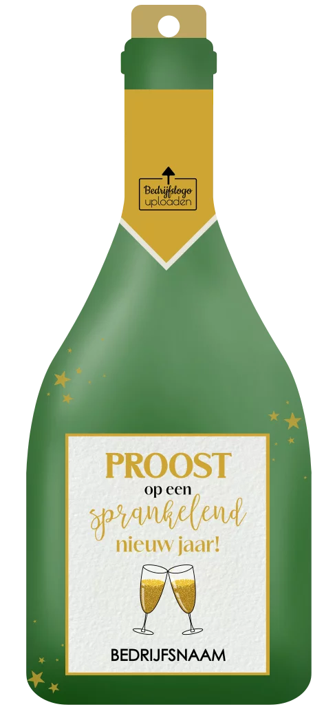 Verras je relaties dit jaar met een unieke kerstkaart in de vorm van een feestelijke champagnefles-ornament! Deze stijlvolle kaart is voorzien van een klein gaatje bovenin, perfect om een touw of lint door te rijgen, zodat de kaart opgehangen kan worden als kerstdecoratie. Voeg eenvoudig je bedrijfslogo toe door erop te klikken en een eigen logo te uploaden. Pas de teksten volledig naar wens aan en bestel een proefdruk om het resultaat te bekijken. Maak het geheel af met een van onze prachtige enveloppen en een sluitzegel voor een extra feestelijke touch.