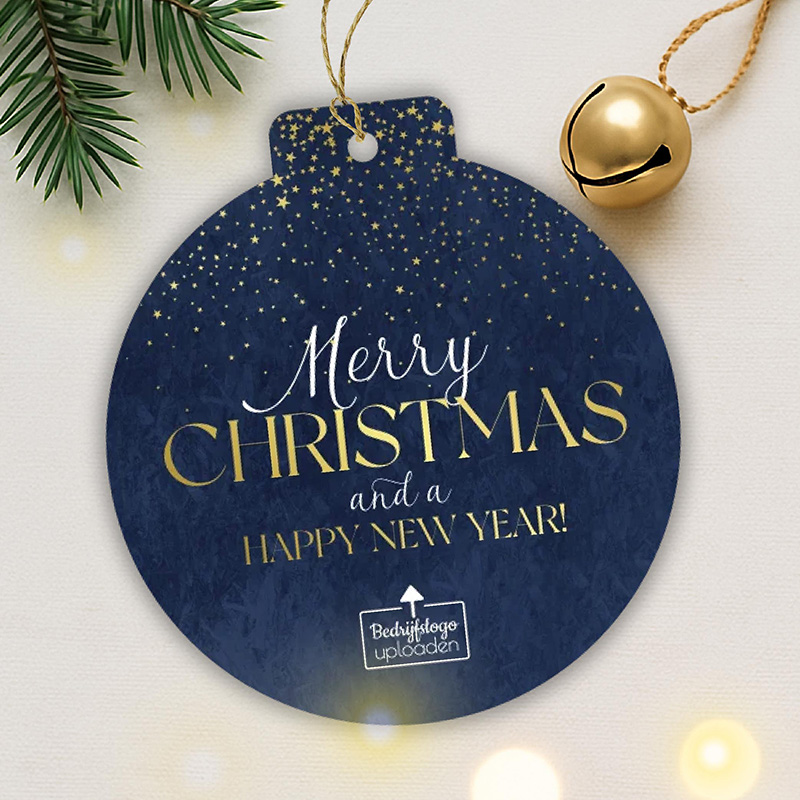 Deze stijlvolle zakelijke kerstkaart in de vorm van een kerstbal is perfect om je bedrijf feestelijk te vertegenwoordigen. Met een donkerblauwe achtergrond en een verfijnde structuur straalt de kaart luxe uit. De goudfolie sterrenregen en stijlvolle tekst voegen een sprankelend detail toe. Dankzij het gaatje kun je een touwtje, dat bij de kaart besteld kan worden, bevestigen, zodat de kaart opgehangen kan worden op een mooie plek.