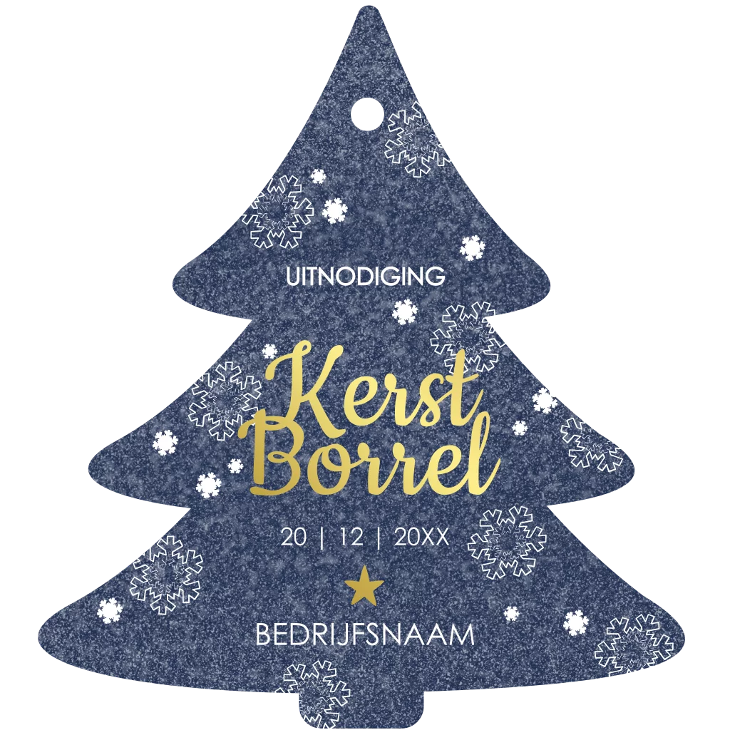 Zakelijke uitnodiging kerstborrel kerstboomvorm blauw sneeuw en folie