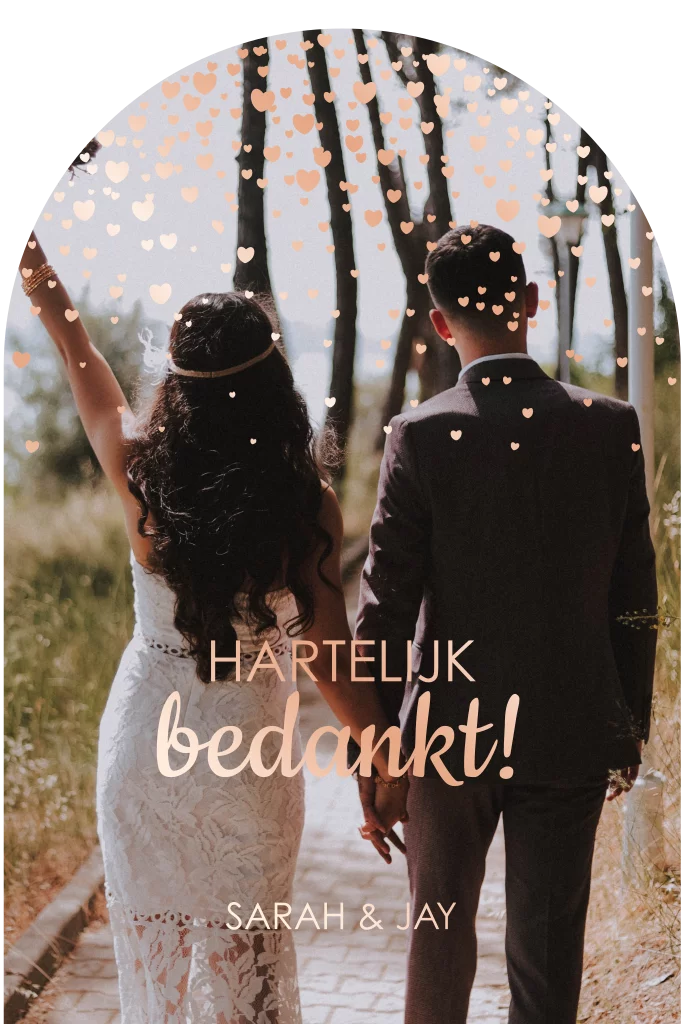 Bedankkaart bruiloft boogvorm met foto en roze hartjesregen
