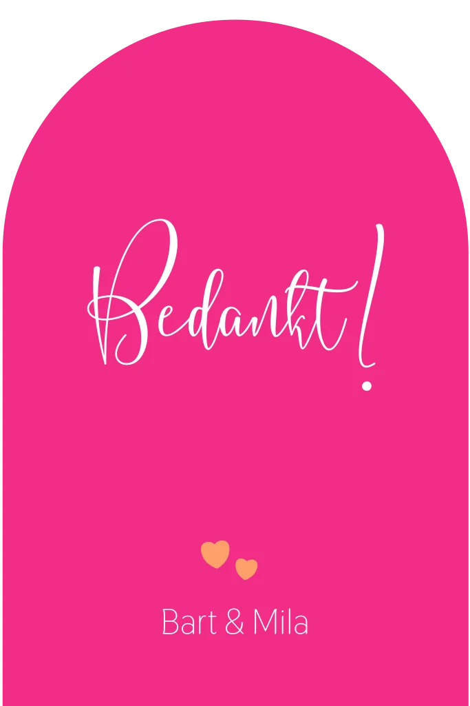 Bedank jullie gasten op een vrolijke en speelse manier met deze opvallende bedankkaart in boogvorm. De knalroze achtergrond gecombineerd met feloranje hartjes zorgt voor een levendige en feestelijke uitstraling. Deze unieke kaart is perfect voor stellen die van kleur en energie houden en hun gasten op een bijzondere manier willen bedanken.