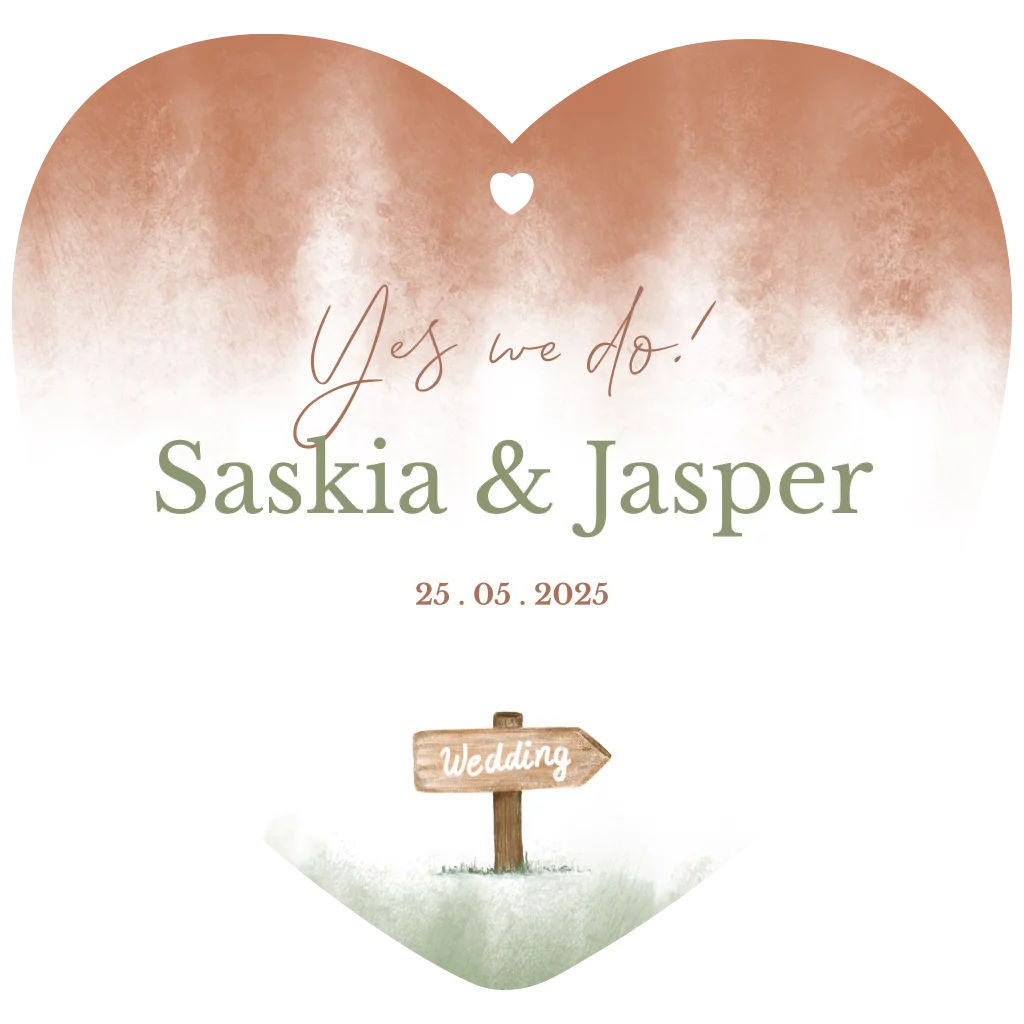 Voeg een vleugje natuurlijke charme toe aan jullie bruiloft met deze unieke hartvormige trouwkaart in rustieke bruin-groene tinten. De kaart is voorzien van een houten wegwijzer met het opschrift 'Wedding' en heeft een hartvormig gaatje bovenaan, perfect om een touwtje of lintje aan vast te maken. Personaliseer deze kaart naar wens en bestel een proefdruk om zeker te zijn van het perfecte ontwerp. Ideaal voor bruiloften in een landelijke, bohemian of vintage stijl.