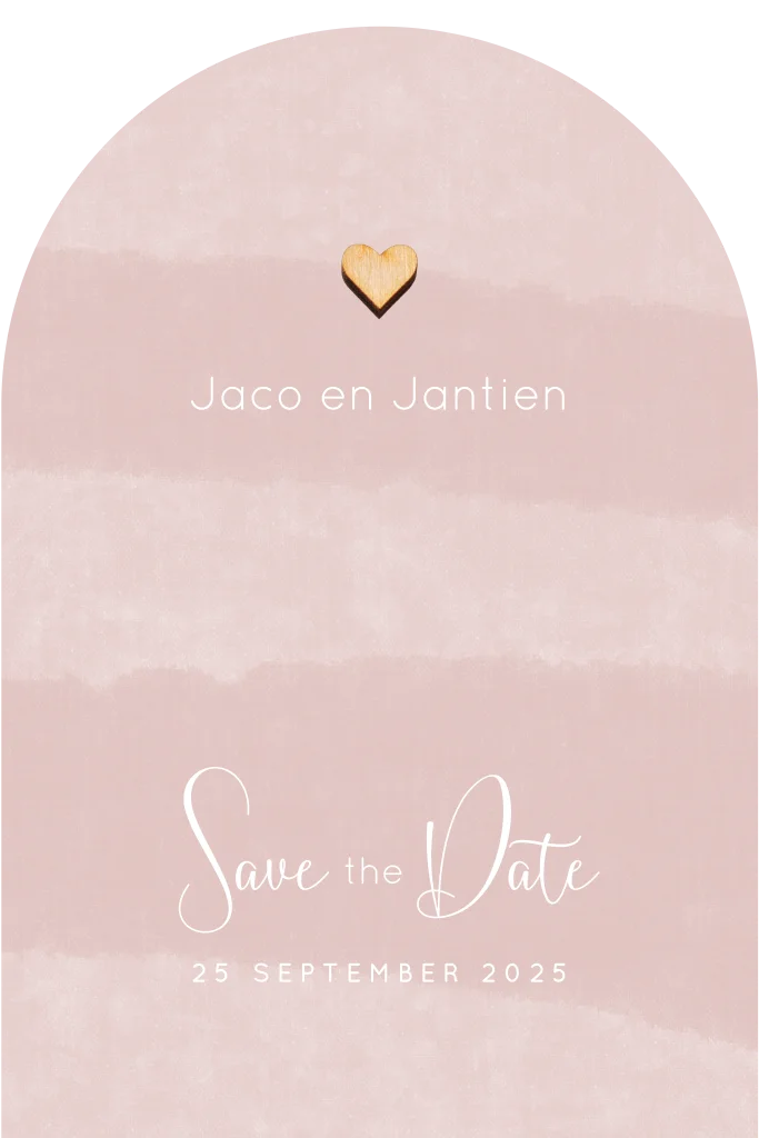 Save the Date kaart met een echt houten hartje en ronde hoeken en een mooi oudroze achtergrond met een structuur.