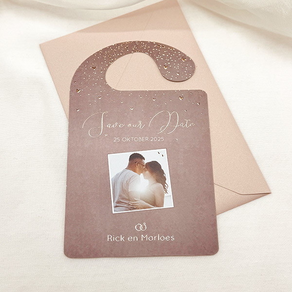 Met deze stijlvolle save the date kaart in de vorm van een deurhanger maak je op een wel heel originele manier jullie trouwdatum bekend!