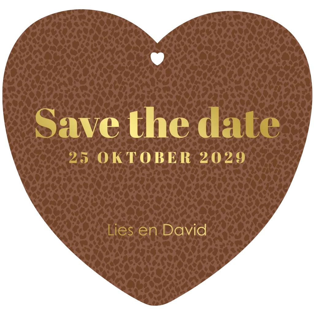 Zorg ervoor dat jullie gasten de datum van jullie bruiloft niet vergeten met deze opvallende save the date kaart in hartvorm. De kaart heeft een trendy bruine panterprint die gecombineerd is met een stoere goudfolie tekst, waardoor het een gedurfde en unieke uitstraling krijgt. Het hartvormige gaatje bovenaan biedt de mogelijkheid om een touwtje of lint toe te voegen, wat de kaart een extra persoonlijke touch geeft. Pas het ontwerp naar wens aan en bestel een proefdruk om ervoor te zorgen dat het helemaal aansluit bij jullie stijl.