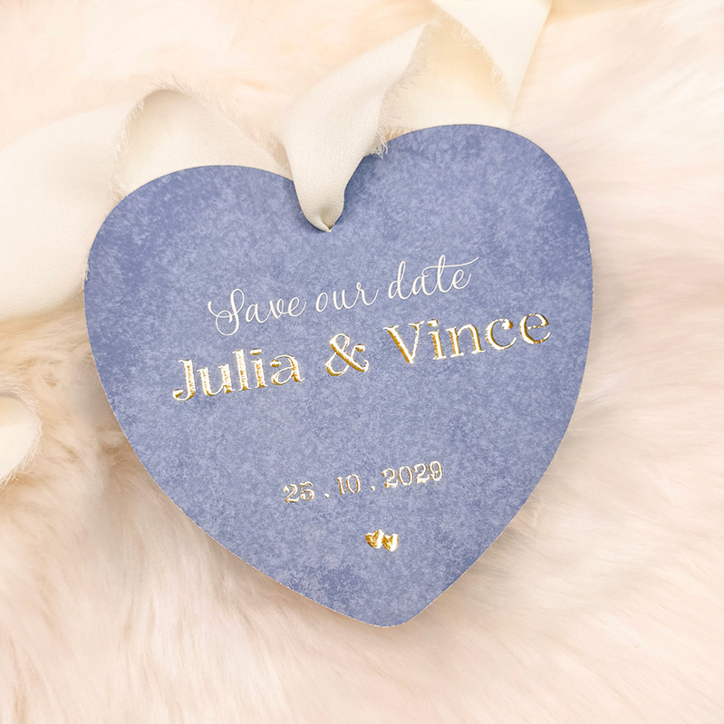 Stuur een luxe save the date kaart met deze elegante hartvormige uitnodiging. De kaart straalt verfijning uit met verschillende vergrijsde blauwtinten en een subtiele blauwe structuur, gecombineerd met prachtige goudfolie bedrukking die de kaart een extra vleugje luxe geeft. Het hartvormige gaatje bovenaan biedt de mogelijkheid om een touwtje of lint toe te voegen, waardoor de kaart op een stijlvolle en persoonlijke manier gepresenteerd kan worden. Pas het ontwerp naar wens aan en bestel een proefdruk om de perfecte save the date kaart te creëren voor jullie grote dag.
