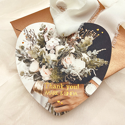 Stijlvolle bedankkaart in de vorm van een hart met foto en goudfolie