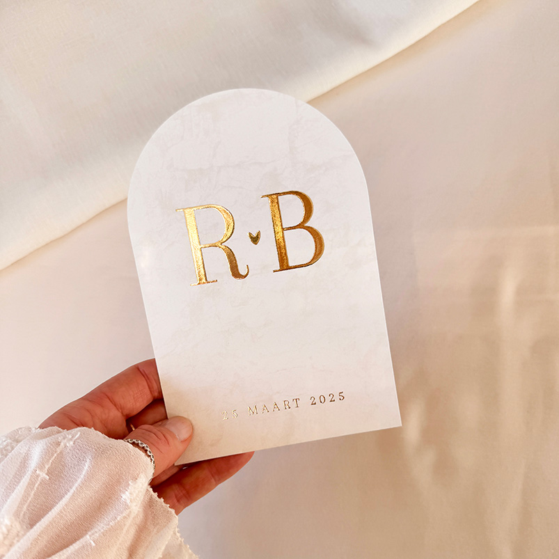 Ontwerp jullie huwelijksuitnodiging met onze stijlvolle klassieke trouwkaart, die een bijzondere boogvorm, ook wel bekend als een arch, heeft. De kaart straalt elegantie uit met zijn beige tint en een subtiele marmeren uitstraling. De initialen van het bruidspaar zijn prachtig in goudfolie gedrukt, waardoor een luxe touch aan het ontwerp wordt toegevoegd. De tekst op de kaart is op een stijlvolle manier geplaatst en kan naar wens worden aangepast, zodat het perfect aansluit bij jullie persoonlijke stijl en voorkeuren. Wil je zeker zijn van het resultaat? Bestel dan een proefdruk om de kaart in handen te hebben en te ervaren hoe prachtig deze eruitziet. Maak van jullie trouwkaart een onvergetelijk aandenken aan jullie speciale dag!