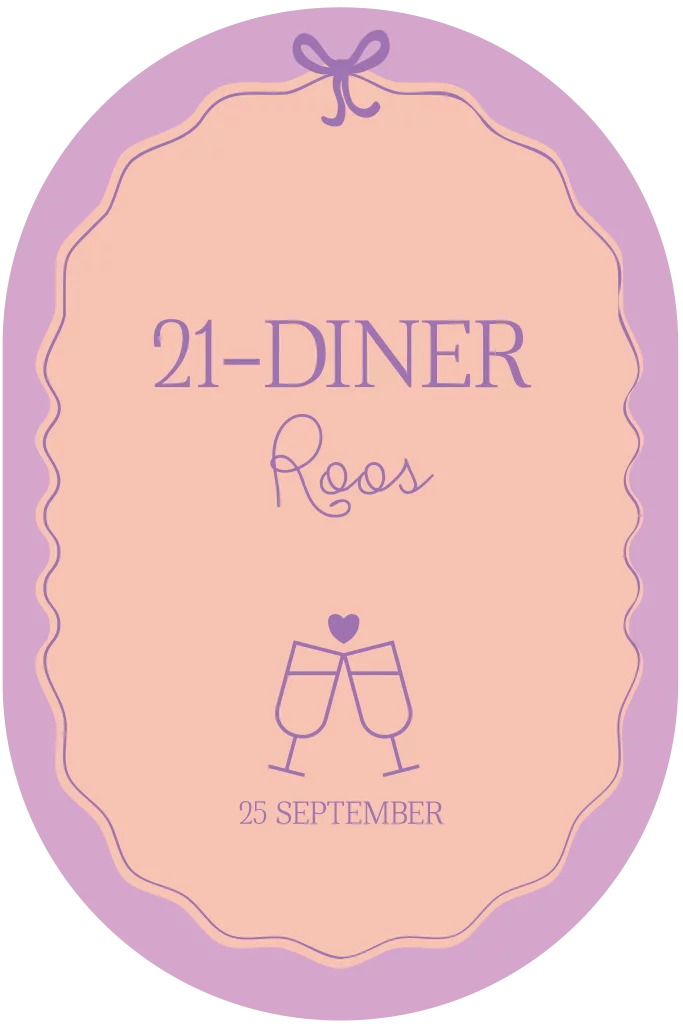Deze speelse en stijlvolle ovale uitnodiging is perfect voor een onvergetelijk 21-diner! De combinatie van lila-paars en zacht zalmroze zorgt voor een chique en trendy uitstraling. Het speelse, sierlijke kronkelkader in paars omlijst de tekst op een elegante manier, terwijl het schattige strikje bovenaan de kaart een extra charmant detail toevoegt. Personaliseer de tekst eenvoudig in de editor en bestel een proefdruk om de kaart in het echt te bewonderen.