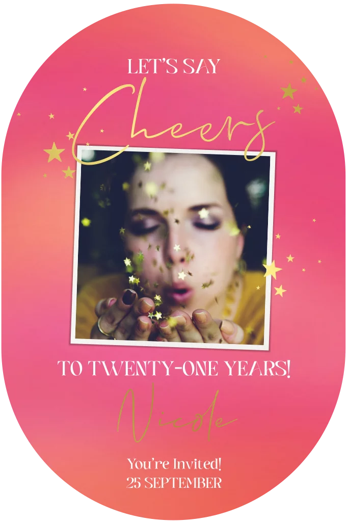 Laat het feest beginnen met deze knalroze 21 diner uitnodiging die absoluut niet te missen is! De uitnodiging heeft een ovale vorm en is ontworpen met opvallende, gemêleerde roze tinten die een holografisch effect creëren – een echte eyecatcher voor jouw speciale avond. De luxe goudfolie afdruk voegt een elegante uitstraling toe, terwijl jouw eigen foto de uitnodiging een persoonlijke touch geeft.