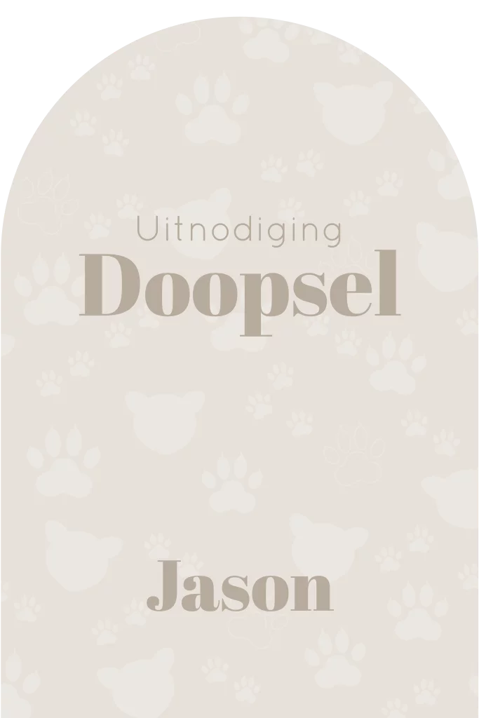 Unieke doopkaart voor een jongen in een bijzondere boogvorm, uitgevoerd in beige tinten met een subtiel speels patroon van panterkopjes en pootafdrukken. Pas de kaart naar wens aan met je eigen teksten. Bestel een proefdruk om het perfecte resultaat te garanderen.