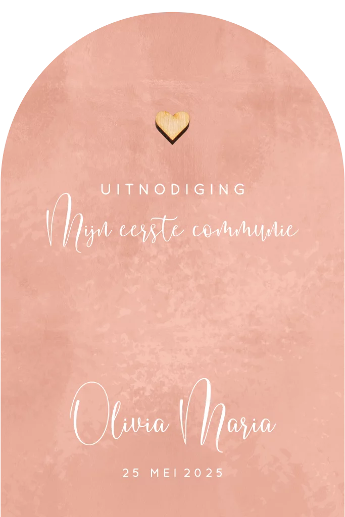 Bijzondere Communiekaart met een boogvorm / arch en echt houten hartje. Deze bijzondere communie uitnodiging heeft een zalm-roze achtergrondkleur die naar wens kan worden aangepast.