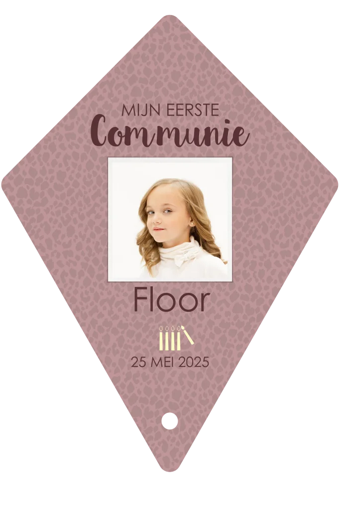 Originele communie uitnodiging voor een meisje met foto in de vorm van een vlieger. Dit hippe en originele communiekaart heeft een roze panter printje als achtergrond. Je kunt deze originele communiekaart naar wens aanpassen.