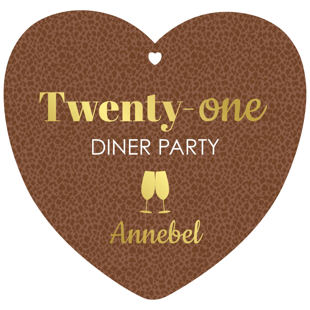 Vier je 21e verjaardag met flair en stijl met onze unieke hartvormige uitnodiging uit de Panterprint & Golden Touch-collectie. Deze uitnodiging heeft een gedurfde bruine panterprint met verfijnde goudfolie tekst, die een trendy en chique uitstraling geeft. Het hartvormige gaatje maakt het mogelijk om een touw of lint toe te voegen voor een extra persoonlijk tintje. Pas de kaart eenvoudig aan naar jouw wensen en bestel een proefdruk om de perfecte uitstraling te garanderen. Maak jouw 21 diner onvergetelijk met deze opvallende en stijlvolle uitnodiging!