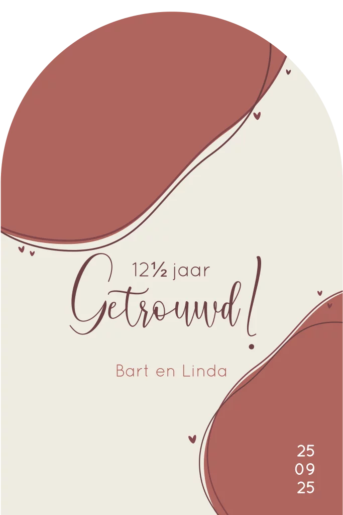 Trendy jubileumkaart met een originele vorm. Deze bijzondere uitnodiging wordt gestanst in een boogvorm / arch en heeft een achtergrond met organische vormen in pasteltinten.